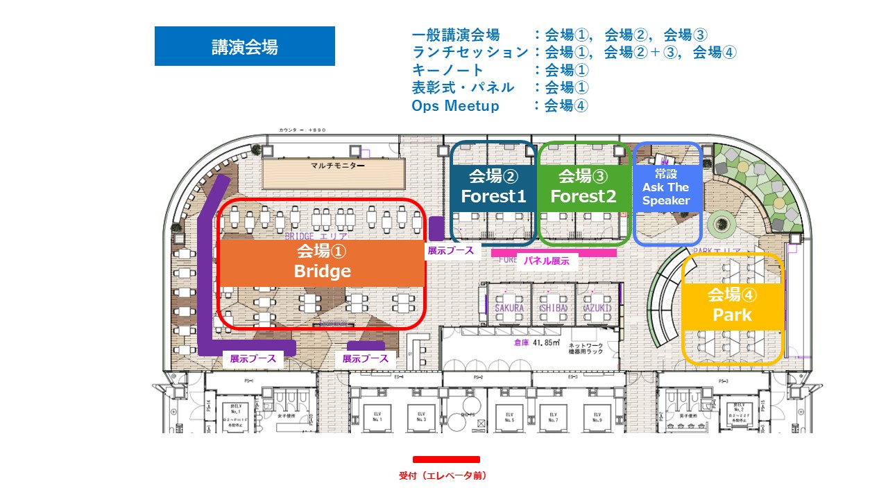 基調講演、スポンサー講演、パネルディスカッション、一般講演、OpsMeetup、アワード表彰、展示ブース、懇親会など